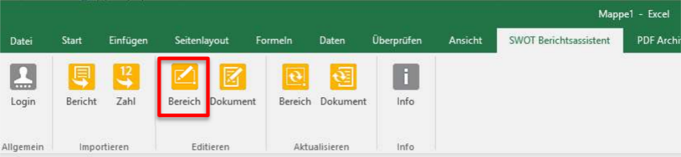 Neben dem Einlesen und Erstellen von Berichten, haben Sie über die Rubrik **„Editieren“** auch die Möglichkeit, Änderungen in Ihren Berichten im SWOT Berichtsassistenten vorzunehmen. Im SWOT Berichtsassistent werden Ihnen alle vorhandenen **Mandanten aus der Datenbank** angezeigt. Die Änderung bezieht sich immer auf eine Zelle im Excel-Dokument. Neben den Mandanten werden Ihnen auch alle vorhandenen **Berichte aus der Datenbank** angezeigt.