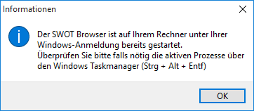 Um einen sicheren Softwarebetrieb zu gewährleisten, darf auf einem Rechner unter einer Windows-Anmeldung nur ein *SWOT Browser* gestartet werden.
