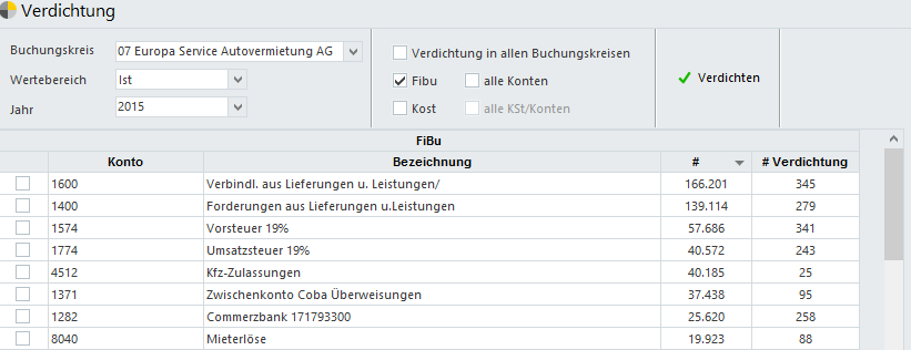 Man sieht pro Konto oder Konto/Kostenstelle in dem Buchungskreis, wie viele Belegeim System \[#] vorhanden sind und wie viele Belege nach der Verdichtung da sein werden \[#Verdichtung]. Man kann zudem entweder alle Konten auswählen oder nur bestimmte Konten. Durch eine Sortierungsieht man sofort die Konten mit den meisten Belegen. Nach der Verdichtung sollten beide Zahlen (\[#] und \[#Verdichtung]) gleich sein, sodass ersichtlich wird, dass tatsächlich nichts mehr zu verdichten ist.