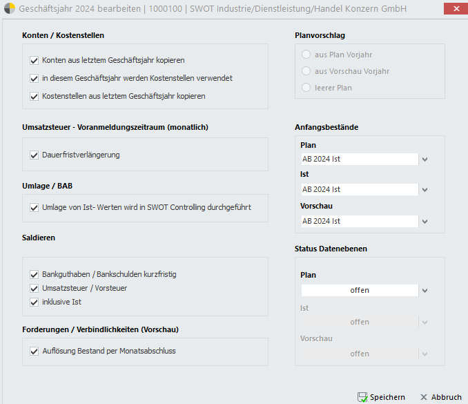 * der Aktivierung der **Saldierung der Bank** (Bankguthaben/ Bankschulden kurzfristig), der **Steuer** (Mehrwertsteuer), wahlweise inklusive der **Ist**-Werte,
