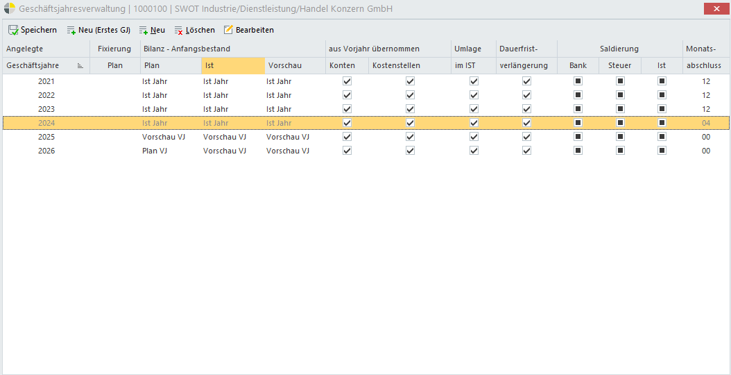 In der Übersicht der Geschäftsjahre werden alle angelegten Geschäftsjahre mit ihren Einstellungen bezüglich