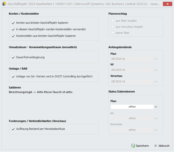 Für Ist-Daten können nur dann Umlagen berechnet werden, wenn in den Einstellungen des **Geschäftsjahres** in der Rubrik **Umlage / BAB** die Auswahl von **Umlage von Ist-Werten wird in SWOT Co durchgeführt** vorab aktiviert worden ist.