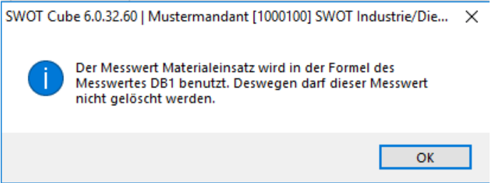 Die gespeicherten Formeln müssen konsistent bleiben. Deshalb wird nicht erlaubt, einen in der Formel beteiligten Messwert zu löschen. Bei einem Versuch jedoch, wird eine entsprechende Warnung angezeigt: