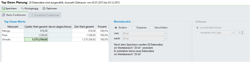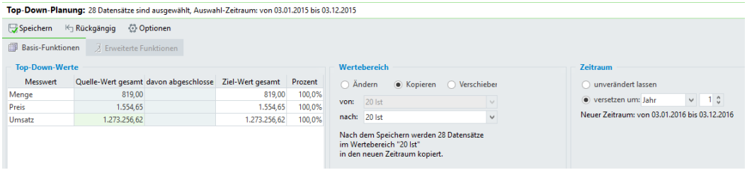 Die „Basis-Funktionen“ stellen eine Massenkopie- und Verteilungsfunktion bereit. Mit dieser Funktionalität können Daten verschiedener Wertebereiche kopiert oder geändert werden. Damit kann man z.B. auf Basis von Ist-Daten des Vorjahres neue Plan-Daten mit prozentueller Erhöhung im aktuellen Jahr erstellen oder auch vorhandene Plan-Daten nach Top-Down-Prinzip über Dimensionen hinweg (z.B. Artikel, Regionen, Verkäufer) gewichtet verteilen.