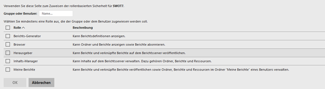 Im Feld Gruppe oder Benutzer muss der Windows-Benutzername eingegeben werden und die passende Rolle auswählt werden.